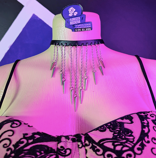 El Chocker de Cadenas Colgantes con Púas es una pieza diseñada para quienes aman un estilo fuerte, audaz y lleno de actitud. Combina una base resistente con púas metálicas que aportan presencia, mientras que las cadenas colgantes añaden movimiento y un toque rebelde que eleva cualquier outfit alternativo, gótico o punk. Perfecto para destacar y llevar el protagonismo en cualquier look.